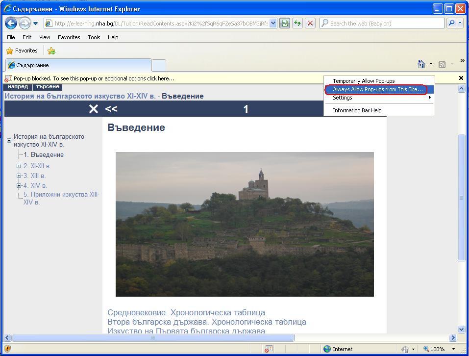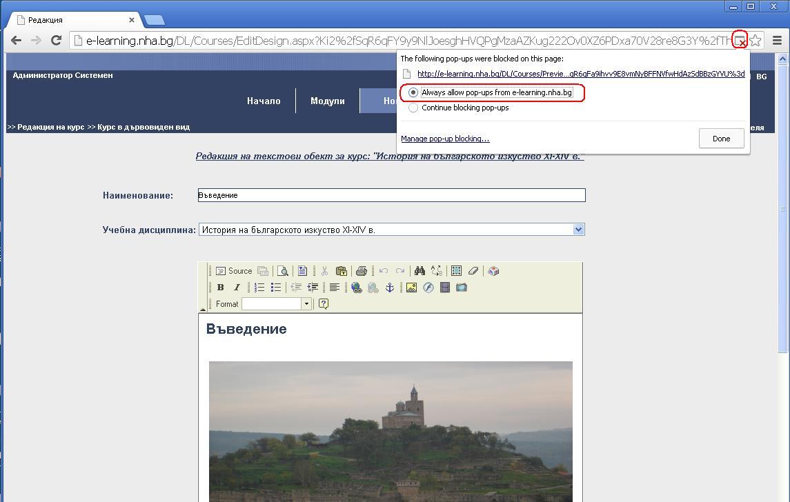 - Необходимо е да отидете с мишката върху иконата за блокирани pop-up-и и да изберете опцията Always allow pop-ups from e-learning.nha.bg.