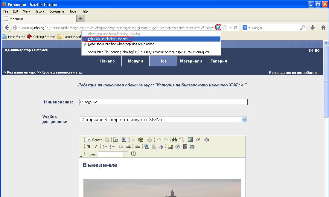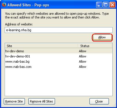 - Необходимо е да отидете с мишката върху иконата за блокирани pop-up-и и да изберете опцията Edit Pop-up Blocker Options. В прозореца с настройки трябва да добавите адреса на платформата за електронно дистанционно обучение чрез избор на бутон Allow